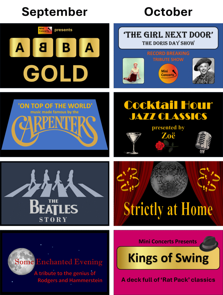 Please contact our administration team to find out more about our themed touring ‘Mini Concerts’ schedule for 2025, including duo shows like ‘The D-Day Dollies’, ‘The Sundaes’, and our wonderful solo shows such as ‘The Girl Next Door’, ‘A Spoonful of Sugar’, and ‘Dolly and Friends’.